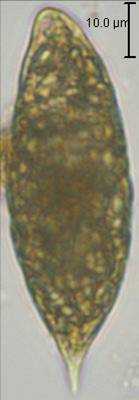 Euglenoids are more animal-like than other algae. They are thought to have evolved from unicellular organisms that engulphed and incorporated a green algae. Their chloroplasts have three membranes and have photosynthetic pigments similar to green algae. Some euglenoids photosynthesize and others have lost their chloroplasts completely and are predatory. Euglenoids have helical strips of semi-stiff material, called pellicles, inside their cell walls which give them a firm but flexible structure. They have a tail (flagella) for swimming and a red “eyespot” that is sensitive to light. Euglenoids cannot produce vitamins B1 or B12 on their own and are often restricted to nutrient enriched environments. Euglenoids, which are unicellular, are typically among the largest algal cells.